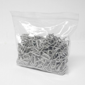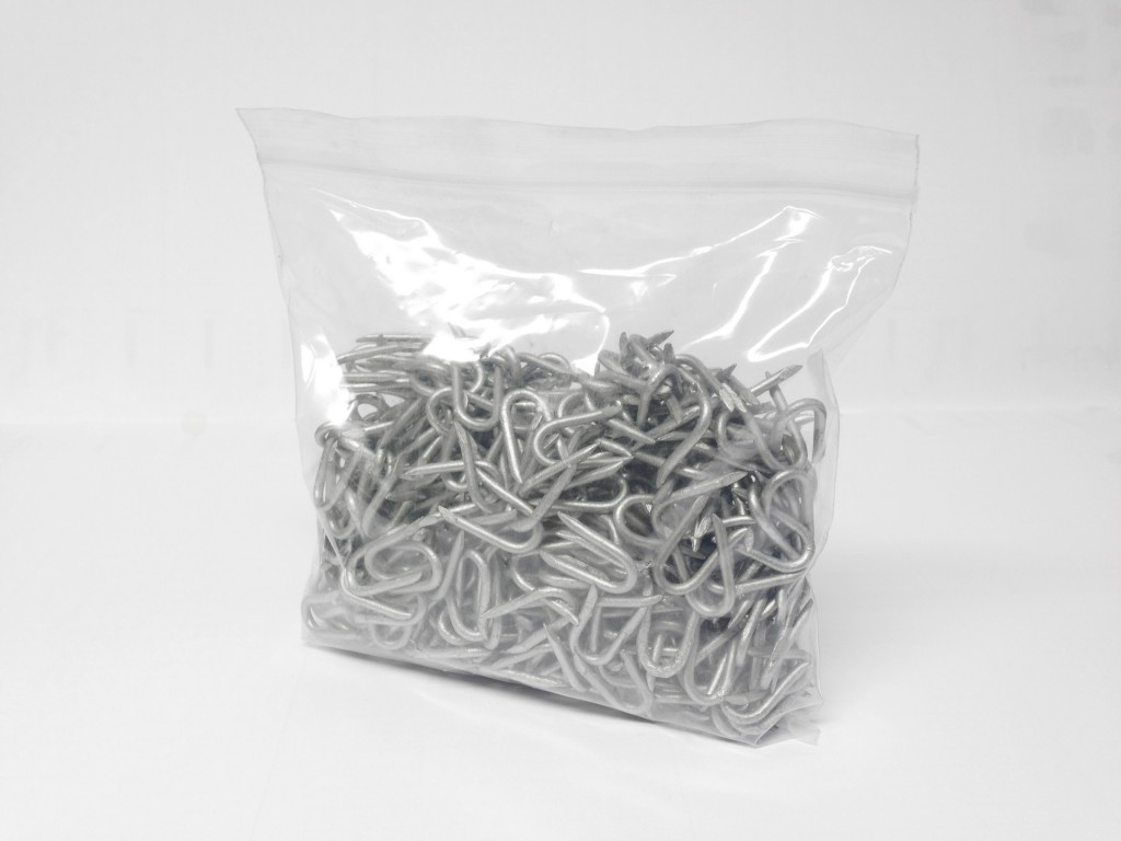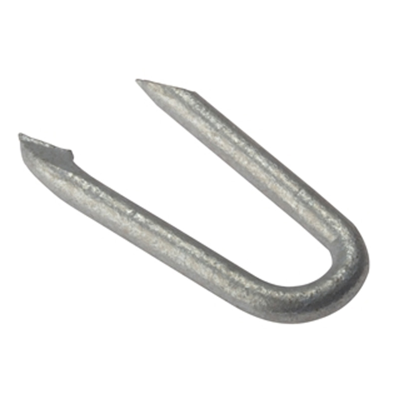 U-shaped round wire nails with two points to hold lengths of wire in position.